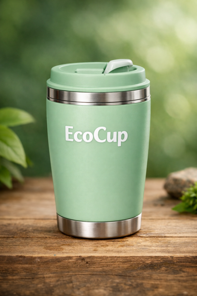 Die Idee hinter dem EcoCup war deshalb klar: Ein langlebiger, funktionaler und zugleich ästhetischer Mehrwegbecher sollte Menschen eine unkomplizierte Alternative bieten. Das pastellgrüne Design steht bewusst für Nachhaltigkeit und Ruhe, während die silbernen Metallakzente Stabilität und Wiederverwendbarkeit symbolisieren. Der dichte Deckel mit Mundstück ermöglicht komfortables Trinken unterwegs – ob auf dem Weg zur Arbeit, beim Studium oder auf Reisen.